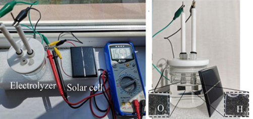 太阳能光电板接受光直射,观察阴极和阳极表面产生氢气和氧气气泡