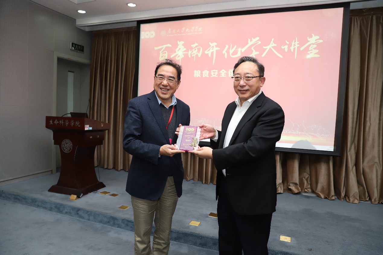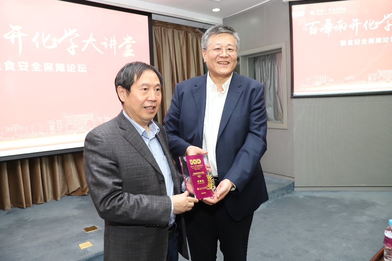 2021年10月16日,值此南开大学化学学科创建100周年之际,“百年南开化学大讲堂——粮食安全保障论坛”在我校八里台校区生物站报告厅成功举行。陈剑平院士和康振生院士出席并做报告,席真教授主持了本次论坛,曹雪涛校长和席真教授为讲座嘉宾颁发了“百年南开化学大讲堂主讲人”证书牌,化学学院师生代表参加了本次活动。