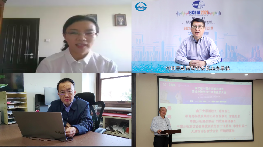 图三 教育部科技发展中心曾艳处长、中国分析测试协会刘成雁副理事长、高校分析测试分会主任委员李景虹院士以及天津市分析测试协会汪嚥理事长分别致辞