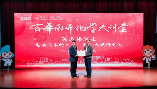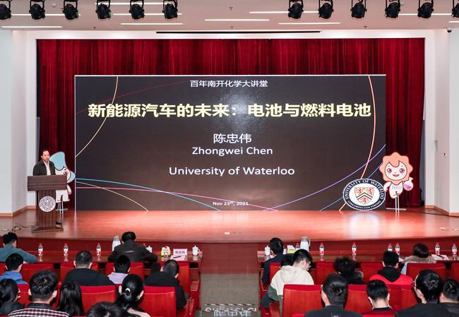 11月23日,加拿大皇家科学院院士、加拿大工程院院士、滑铁卢大学清洁能源先进材料实验室主任陈忠伟教授做客南开大学“新能源-卓越讲座”暨“百年南开化学大讲堂”,在八里台校区天南联合楼四楼报告厅作了题为《新能源电池的未来:电池与燃料电池》的学术报告。中国科学院院士、南开大学副校长陈军,南开大学化学学院负责人分别为陈忠伟教授颁发“新能源-卓越讲座”荣誉证书和“百年南开化学大讲堂”纪念奖牌,化学学院200余名师生参加讲座。