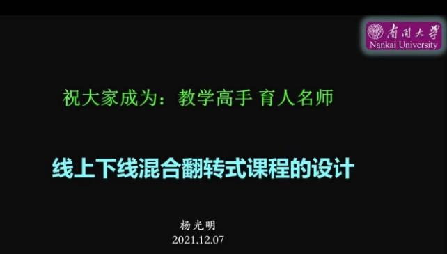 杨光明教授作为四门通识课程的主讲人,做了“线上线下混合翻转式课程的设计”的报告,列出详实数据解读国家对建设混合式课程的倡导以及目前混合式课程的不足。以一门国家一流混合式课程“生态文明”为案例从上课形式到实现目标,从上课时间安排到线上、线下学习安排进行了详细说明,从考核方式中的“师生交流”对培养学生的挑战性,学生收到的意外收获出发,指出师生交流的重要性和必要性。