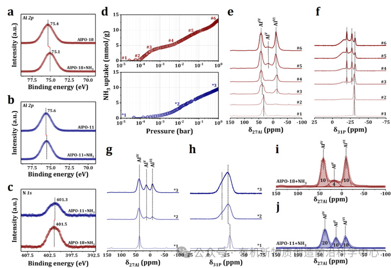 图2. AlPO-18和AlPO-11分子筛中氨吸附的准原位X射线光电子能谱和核磁共振波谱