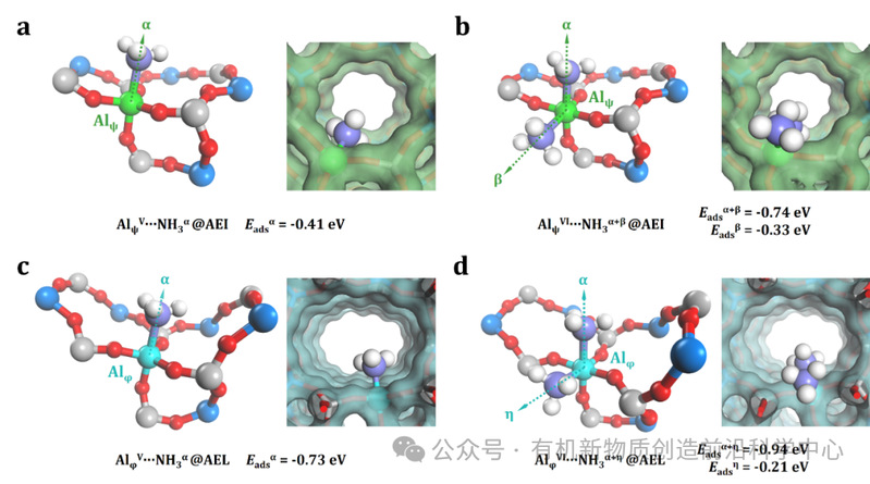 研究人员通过原位红外光谱、准原位X射线光电子能谱和魔角旋转核磁共振波谱技术(图2)与密度泛函理论计算(图3)相结合,清晰地揭示了AlPO分子筛中路易斯Al中心位点的性质和氨键合行为:AlPO-18分子筛倾向于首先吸附两分子氨形成非常稳定的六配位2NH3@AlVI物种(> 40%),随后形成少量五配位1NH3@AlV物种(~15%),这两步导致了晶格结构的显著变化,因此可用作捕获痕量氨的一次性吸附剂;而在AlPO-11分子筛中,相对亚稳态的五六配位1,2NH3@AlV,VI物种同步形成,吸附过程中AlV(25%)或AlVI(25%)的形成没有明显的选择性(即吸附一分子或两分子氨的吸附能接近,图3)。此项研究明确了AlPO分子筛中Lewis位点与氨分子之间的主客体相互作用,有望推动具有开放骨架结构的磷酸铝分子筛材料在氨吸附等分离过程中的应用。