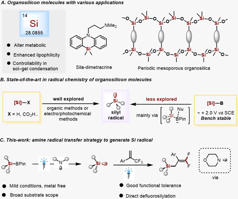 硅衍生物在作为关键原料在相关领域内至关重要,但硅硼酸频哪醇酯的高氧化电位限制了其光催化硅烷化应用。传统方法依赖亲核试剂降低电位,而胺自由基作为一种创新策略,展现出活化Si–B键的潜力,为绿色合成提供新途径。但目前含硅和偕二氟烯基片段在多数化合物中独立存在,而两者独特的构型及其在药物化学中的应用前景,将其引入同一分子将为药物化学家提供全新的研究视角。