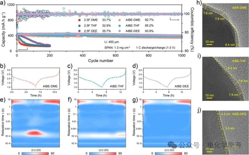 AIBE 与 SPAN 正极的兼容性及界面稳定性。(a) 循环性能曲线显示,AIBE-DEE 组装的 Li||SPAN 半电池在 1000 次循环后容量保持率达 93.9%,显著高于 AIBE-DME(82.7%)与 AIBE-THF(85.2%);(b)-(d) 充放电曲线表明 AIBE-DEE 的电压平台更稳定;(e)-(g) 原位分布弛豫时间(DRT)分析显示,AIBE-DEE 的电极 / 电解质界面阻抗(Rₑₑᵢ)与电荷转移阻抗(R_ct)更低且循环中变化小,Li⁺传输动力学更优;(h)-(j) 高分辨透射电子显微镜(HR-TEM)图像显示,AIBE-DEE 中 SPAN 正极循环后 CEI 更薄(3.8 nm),而 AIBE-DME、AIBE-THF 中 CEI 较厚且不均匀,证明 AIBE-DEE 能抑制正极结构降解。