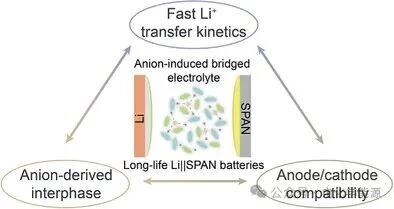 传统锂离子电池虽在便携电子设备和电动汽车领域应用广泛,但正极所用过渡金属存在资源有限、价格上涨等问题,促使研究者探索低成本、绿色可再生的 sulfur 基正极材料;然而,传统碳 / 硫复合 正极面临多硫化锂穿梭、活性物质团聚、循环寿命短等难题,硫化聚丙烯腈(SPAN)因高导电性、无自放电等优势成为潜在替代材料,但锂金属负极与 SPAN正极 组合仍受多硫化锂穿梭导致的负极腐蚀、容量衰减等问题制约。现有电解质优化策略(如碳酸盐基极性电解质、弱溶剂化电解质、高浓度电解质等)虽能构建相对稳定的电极 / 电解质界面(EEI),但存在库伦效率低、锂离子传输动力学迟缓、电解质本体中锂离子解离能力弱等缺陷,难以同时满足 anode/cathode 兼容性、阴离子衍生界面形成及快速锂离子传输的需求,为下一代长寿命锂 - 硫化聚丙烯腈(Li||SPAN)电池的实际应用带来挑战,因此亟需开发新型电解质设计策略以解决上述瓶颈。