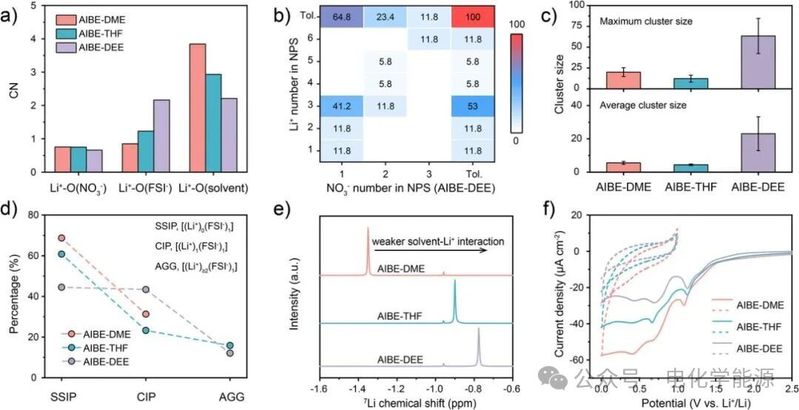 不同溶剂(DME、THF、DEE)制备的 AIBE 的结构差异。(a) 配位数对比显示,AIBE-DEE 中 Li⁺与 NO₃⁻、FSI⁻的配位数最高,与溶剂的配位数最低,说明其阴离子主导特性更显著;(b) NO₃⁻参与的溶剂化结构(NPSs)统计表明,AIBE-DEE 中单个 NO₃⁻更易与多个 Li⁺作用;(c) 簇尺寸分析显示 AIBE-DEE 的最大与平均簇尺寸最大,与溶剂极性低的特性相关;(d) 离子对类型占比数据显示 AIBE-DEE 的 SSIP 占比最低,进一步证实其强离子聚集性;(e)⁷Li NMR 光谱中 AIBE-DEE 的化学位移最靠下,表明其溶剂与 Li⁺相互作用最弱;(f) 循环伏安曲线显示 AIBE-DEE 的还原电流最低,Li 兼容性最优。