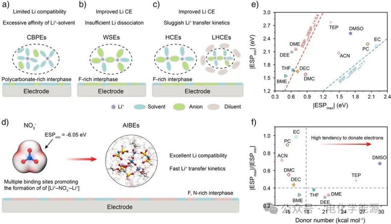 该图通过对比现有电解质与 AIBE 的设计逻辑,阐明 AIBE 的核心优势。其中,(a)-(c) 分别展示传统碳酸盐基极性电解质(CBPEs)、弱溶剂化电解质(WSEs)及高浓度 / 局部高浓度电解质(HCEs/LHCEs)的局限:CBPEs 因溶剂与 Li⁺强亲和性导致 Li 兼容性差,WSEs 存在 Li⁺解离不足问题,HCEs/LHCEs 则面临 Li⁺传输动力学迟缓;(d) 呈现 AIBE 的设计原理,强调 NO₃⁻的多结合位点可促进 [Li⁺-NO₃⁻-Li⁺] 形成,实现优异 Li 兼容性与快速 Li⁺传输,同时构建富 F、N 的稳定界面;(e)-(f) 通过溶剂的 | ESPₘₐₓ|/|ESPₘᵢₙ| 比值与给体数(DN)筛选标准,确定 DME、THF、DEE 为适配 AIBE 的溶剂,为后续电解质制备提供依据。