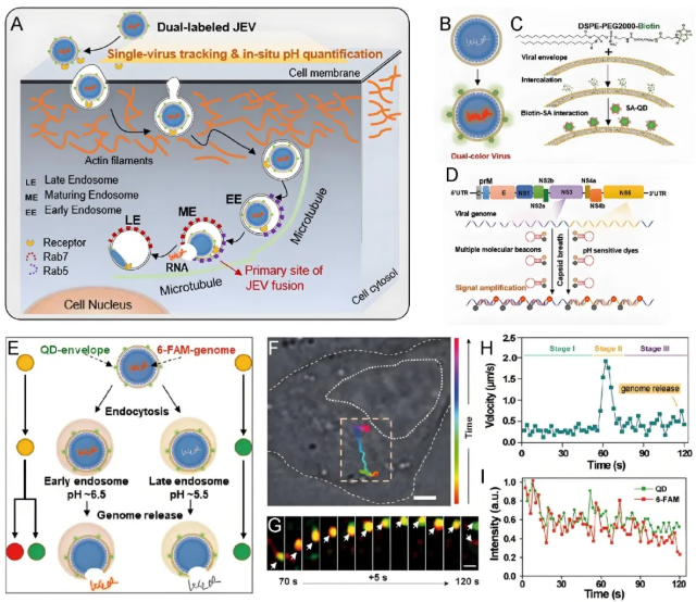 膜融合与基因组释放的实时可视化:研究团队以RNA包膜病毒日本脑炎病毒(Japanese encephalitis virus, JEV)为模型,整合了单病毒示踪技术与双标记原位pH定量方法:通过量子点标记病毒包膜,配合pH敏感染料标记病毒RNA,成功建立了可在单病毒水平实时可视化并定量分析基因组释放过程的技术平台。研究发现:(1)JEV的细胞内运输严格依赖肌动蛋白和微管细胞骨架系统;(2)病毒膜融合事件主要发生在早期内体向晚期内体过渡的成熟阶段(图6)。