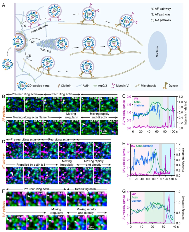 病毒胞内运输路径的动态解析:团队以IAV为模型,通过整合单病毒示踪技术与多色活细胞动态成像系统,实现了对单个病毒进胞后到达微管全过程的原位实时解析。研究发现,病毒可通过三条独立且相互协调的途径完成这一过程:(1)Myosin VI驱动途径(AF途径):病毒在Myosin VI驱动下沿肌动蛋白丝移动至微管。值得注意的是,该途径存在独特的驱动切换机制:动力蛋白在肌动蛋白丝上以搭便车方式伴随转运,当病毒抵达肌动蛋白丝-微管交界处时,dynein接管并驱动病毒沿微管继续向核周区移动,而Myosin VI仍保持与囊泡的结合共转运。这一发现首次揭示了病毒在两种细胞骨架系统间的精密转接机制。(2)肌动蛋白尾推动途径(AT途径):病毒在Arp2/3复合体介导的肌动蛋白聚合形成的肌动蛋白尾的推动下到达微管。该途径仅在病毒高载量感染时显著激活,提示细胞可能通过特定信号通路调控不同转运途径的切换。(3)非肌动蛋白依赖途径(NA途径):病毒直接到达微管,未经历与肌动蛋白相关的运动。这种途径占比最高(~70%)且最快到达微管(图4)。