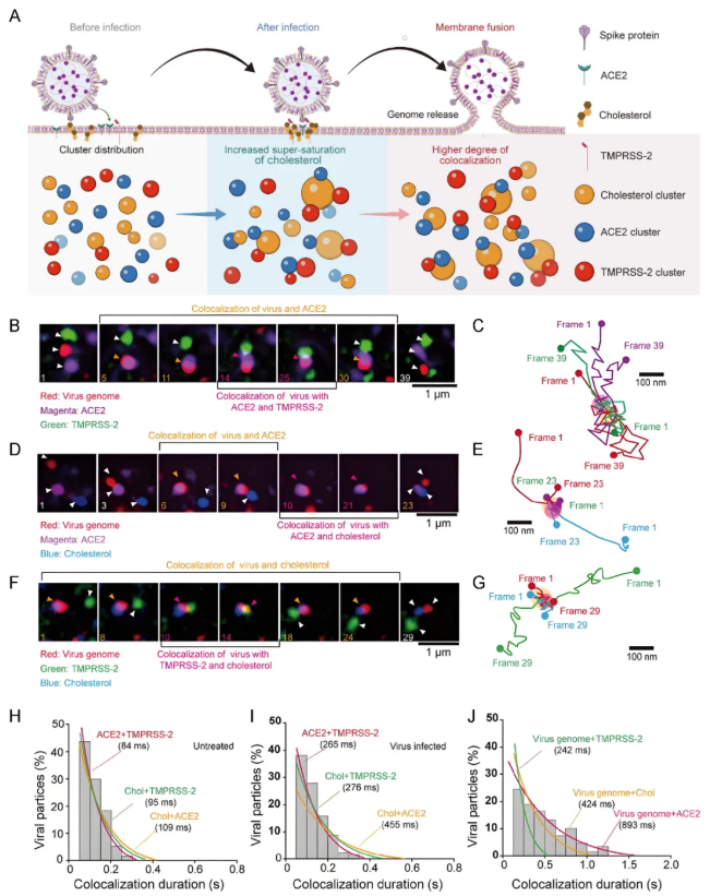针对通过质膜融合方式入侵的病毒,研究团队成功开发了一种基于量子点标记与杂交链式反应(HCR)的定量单病毒示踪技术。该技术为动态、定量研究病毒的膜融合过程提供了全新平台。具体来说,采用生物素化磷脂(DSPE-PEG2000-biotin)嵌入病毒包膜并与链霉亲和素修饰的量子点(SA-QDs)特异性结合,实现了病毒包膜的高效标记。同时,创新性地应用Cy5标记的HCR链自组装系统,实现了病毒基因组的特异性标记和荧光信号放大,有效克服了传统荧光染料在亮度、光稳定性和信噪比等方面的固有局限。通过单病毒示踪技术结合超分辨率显微镜成像,研究发现SARS-CoV-2可能通过诱导过饱和胆固醇在ACE2和TMPRSS-2受体周围形成更大尺度的簇状聚集,从而促进病毒包膜与质膜的融合及基因组释放。
