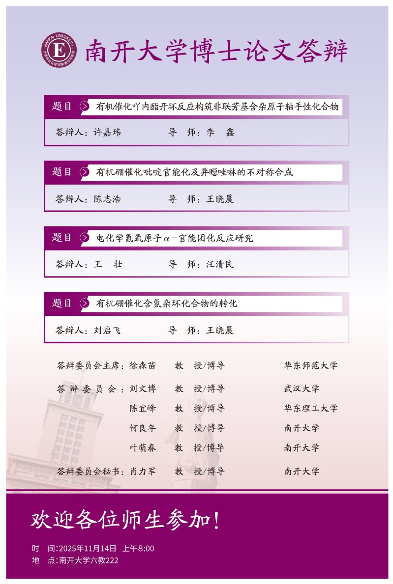 化学学院学术学位博士研究生学位论文答辩 许嘉玮,陈志浩,王壮,刘启飞