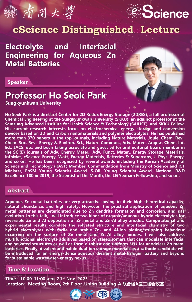 eScience Distinguished Lecture:Electrolyte and Interfacial Engineering for Aqueous Zn Metal Batteries