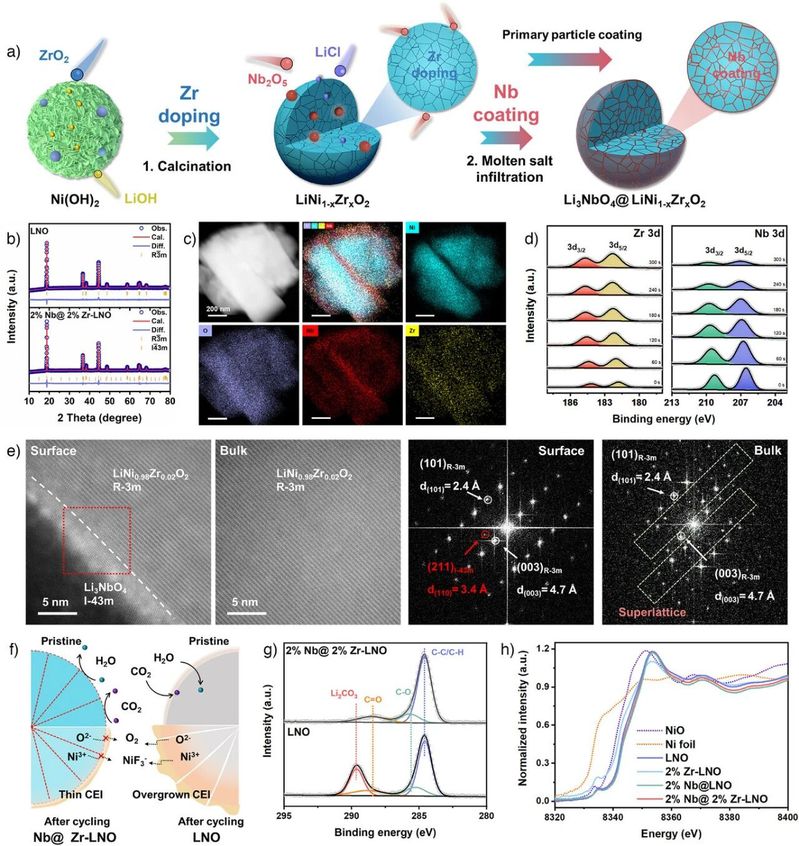 图1. LNO和Nb@ Zr-LNO的结构表征。a) Nb@ Zr-LNO合成示意图。b) LNO和2% Nb@ 2% Zr-LNO的XRD图谱及Rietveld精修结果。c) 2% Nb@ 2% Zr-LNO的HAADF-STEM图像及元素分布图。d) 从2% Nb@ 2% Zr-LNO获得的Zr 3d和Nb 3d XPS谱图。e) 2% Nb@ 2% Zr-LNO的HAADF-STEM图像及相应的FFT图样。f) 空气暴露后LNO和2% Nb@ 2% Zr-LNO的对比降解示意图。g) 空气暴露7天后LNO和2% Nb@ 2% Zr-LNO的XPS C 1s谱图。h) 空气暴露7天后LNO和2% Nb@ 2% Zr-LNO的归一化Ni K-edge XANES谱图。
