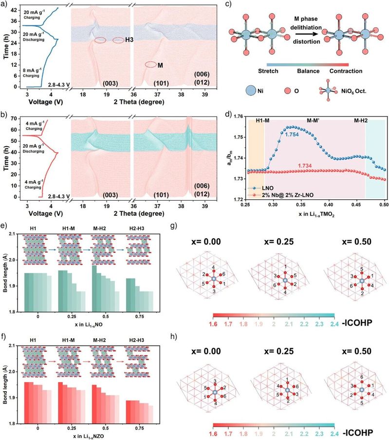 图4. 中间相。a) LNO和b) 2% Nb@ 2% Zr-LNO在准平衡条件下慢充电的电压曲线及原位XRD图谱。c) M相变过程中八面体畸变示意图。d) Li₁₋ₓTMO₂中x对应aₘ/bₘ晶格参数比值演变。e), g) LNO和f), h) 2% Nb@ 2% Zr-LNO在脱锂过程中平均Ni–O键长和-ICOHP的变化。