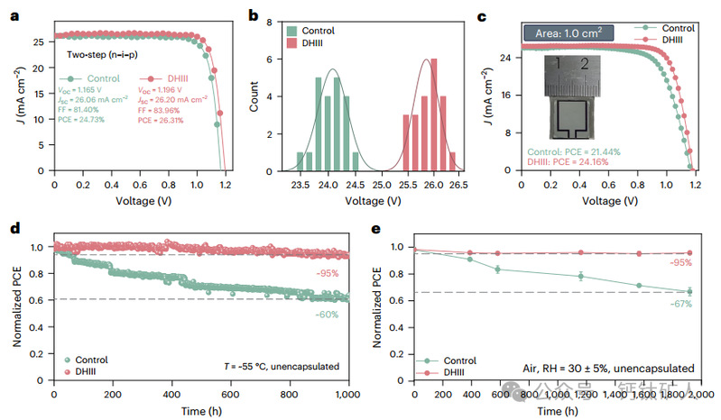 基于此,南开大学刘永胜教授、陈永胜院士等人提出一步法策略:于前驱体溶液中引入有机卤化铵盐,诱导自发形成近相纯的二维钙钛矿埋底界面。单晶结构分析强调了分子工程在促进二维钙钛矿相的自发形成中的关键作用。有机间隔物的低偶极矩和平面刚性结构促进了它们在钙钛矿晶界的聚集,随后迁移到膜的底部界面。该二维层同步实现埋底界面均匀结晶与高效缺陷钝化,器件功率转换效率达26.31%(认证值26.02%)。未封装器件经1000小时持续光照后,仍保有初始效率之95%。该论文近期以“Spontaneous 2D perovskite formation at the buried interface of perovskite solar cells enhances crystallization uniformity and defect passivation”为题发表在顶级期刊Nature Photonics上。