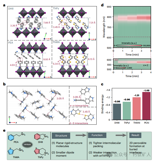 总之,作者等人开发了一步法策略,可在埋底界面自发形成近相纯二维钙钛矿,同步实现结晶均一化与缺陷钝化,其驱动力源于有机间隔阳离子的分子设计。与ThMA⁺及PEA⁺相比,DHII⁺与ThPy⁺具有更低偶极矩及更优平面刚性结构,可强化分子π–π堆叠并削弱与FAPbI₃富集钙钛矿的相互作用,从而在“自上而下”结晶过程中被迁移至薄膜底部。该“分子沉降”机制调控结晶动力学,优化晶体取向并抑制界面非辐射复合,使光伏性能与稳定性显著提升。本工作凸显了分子设计在控制埋底二维钙钛矿分布、调控结晶动力学及优化晶体取向中的核心作用,为PSCs的进一步发展提供了可行路径。