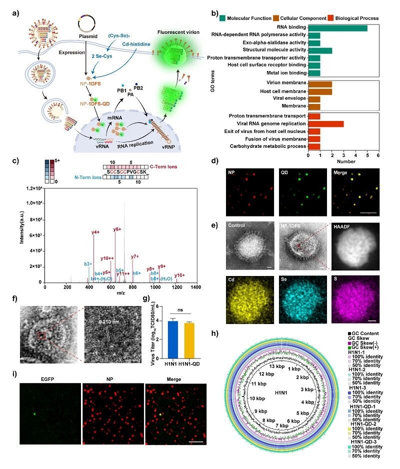 图5. 在病毒宿主细胞内精准调控量子点进入病毒颗粒内部。(a) 量子点发光病毒颗粒形成原理示意图。(b,c) H1N1-量子点病毒颗粒蛋白组分的GO注释及质谱分析; (d,e) H1N1-量子点病毒颗粒的代表性免疫荧光图像及透射电子显微镜元素mapping;(f) 病毒颗粒内量子点的晶格结构。(g,h) 用于探究量子点对病毒颗粒活性影响的半数组织培养感染剂量(TCID₅₀)测定及病毒全基因组测序。 (i) 转染EGFP-NP质粒的宿主细胞中,新增殖子代病毒颗粒的代表性免疫荧光图像。