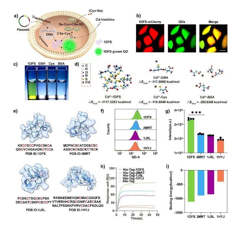 图2. 用于量子点定位合成的 1DFS 肽筛选。(a) 活细胞内1DFS原位定位合成量子点示意图; (b) 表达1DFS 的细胞中量子点合成的代表性共聚焦图像; (c,d) 不同配体存在下的胞外量子点合成及用于解释富含半胱氨酸多肽适配量子点合成的量子化学计算结果; (f,g) 流式细胞术定量分析不同富含半胱氨酸多肽所合成量子点的荧光强度;(h,i) 不同富含半胱氨酸多肽与 Cd2+离子结合亲和力的表面等离子体共振分析及量子化学计算结果。