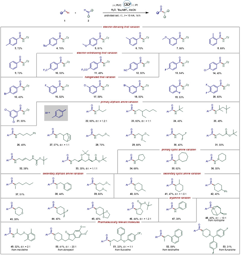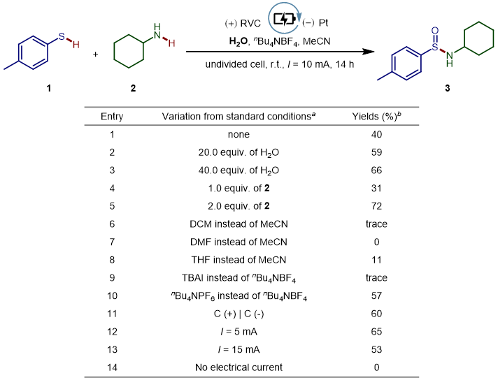 为验证所提出策略的可行性,作者选择市售的对甲苯硫醇1和环己胺2作为模版底物。初步研究评估了一系列电解质、溶剂与空气氛围的组合,并采用网状玻璃碳(RVC)为阳极、铂为阴极,在10 mA/cm²的电流密度下进行反应。大部分初始实验仅仅得到痕量或无产物,而以水(H₂O)作为氧源时,可获得可观产率的目标产物3(图2,条目1)。系统筛选 胺2 和H₂O的当量后,目标产物 3 产率可达72%(图2,条目2-5)。广泛优化其他应参数(包括溶剂、电解质、电流、电极及添加剂)均导致产率降低(图2,条目6-13)。对照实验证实,电是该反应发生的必要条件(图2,条目14)。