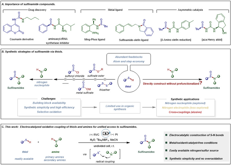 硫醇和胺是电化学中公认的自由基前体,能参与多种转化途径。这些自由基在交叉亲电偶联和电氧化还原交叉偶联反应中起关键作用。利用硫醇和胺生成偶联中间体,通过自由基途径直接构建S-N键,将为现有的非自由基方法提供有力补充。作者设想通过硫自由基与氮自由基的偶联反应实现S-N键的一步构建,在引入合适氧源的同时利用电子作为氧化还原剂,避免化学试剂的使用。该策略的难点在于自由基寿命极短,因此控制其发生交叉偶联而非自身二聚至关重要。此外,选择性氧化仍是严峻挑战。