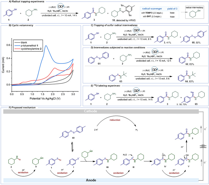 为深入理解电化学反应过程,作者监测了标准条件下电解过程的电极电位。阳极电势稳定维持在约+2.20 V(vs. Ag/AgCl),这一结果与循环伏安分析数据一致(图5B)。结果表明1和2均具有电氧化活性,在相对于Ag/AgCl电极+1.70 V和+2.15 V有明显的氧化峰。在标准反应条件下成功分离出硫醚化合物60,证实了硫自由基的生成(图5C)。此外,将硫化物61置于标准反应条件下反应,以63%的产率得到次磺酰胺62(图5D),为硫中心自由基参与S-N键形成提供了证据。次磺酰胺63在标准反应条件下转化为亚磺酰胺64,表明次磺酰胺可能作为反应中间体参与反应(图5D)。在 H₂¹⁸O 存在下,1与2发生偶联,得到的产物3和65有明显的¹⁸O掺入(比例为5:95),表明H₂O是产物中亚磺酰基(-SO-)的氧源(图5E)。