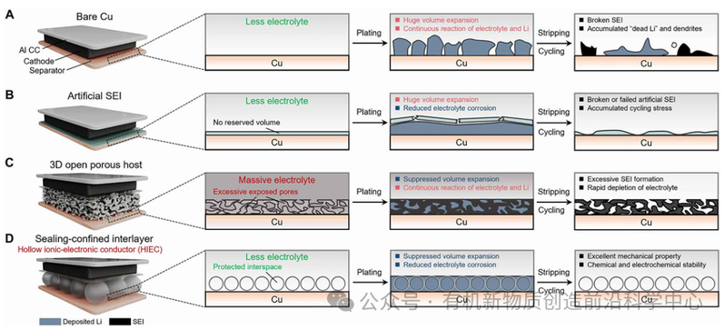 图1. 不同夹层配置的无负极锂金属电池结构示意图。(A) 使用裸铜作为负极的传统AFLMB。(B) 使用人工SEI修饰集流体的AFLMB:缓解了电解液对锂沉积的腐蚀,但在循环中缺乏体积适应性。(C) 使用3D开放多孔宿主的AFLMB:抑制了锂沉积膨胀,但因过度形成SEI而加速了电解液消耗。(D) 使用HIEC修饰集流体的AFLMB:作为一个密封限域的夹层,兼具保形SEI和3D宿主的双功能协同配置。背景色深度代表电解液用量,其中3D多孔宿主颜色最深是因为其开放孔隙需要比正常条件更多的电解液浸润。