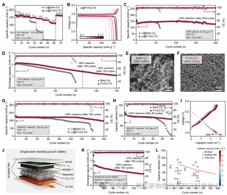 解析:此图验证了“全电池性能与实用性”。无论是搭配商业化LFP还是高能量密度NCM811正极,在贫电解液、有限锂源等苛刻条件下,采用P-HCLTO的电池均展现出远优于裸铜的循环稳定性。特别是软包电池(J-L)的成功演示,以及与同类研究相比的优异性能(L),强有力地证明了该技术的实际应用潜力。