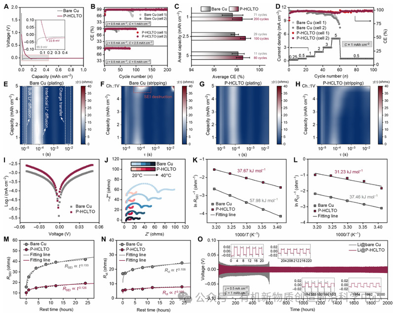图6. 锂电镀/剥离的长期稳定性与动力学对比。(A-H) 使用裸铜和P-HCLTO的Li||Cu半电池的电化学评估(包括过电位、库伦效率、倍率性能、DRT分析)。(I-O) 使用Li@裸铜和Li@P-HCLTO的Li||Li对称电池的电化学评估(包括交换电流密度、EIS、活化能、界面阻抗演化、长循环稳定性)。