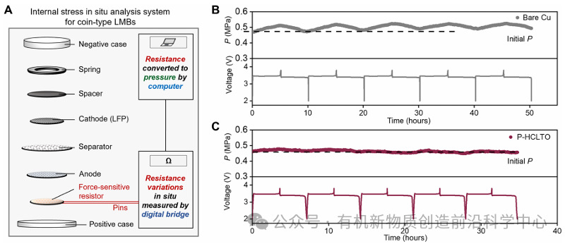 图8. 用于扣式LMBs中锂电镀/剥离的原位内部应力监测(A) 用于扣式LMB配置的内部应力分析系统示意图。(B, C) 使用裸铜和P-HCLTO的AFLMBs的恒电流充放电曲线及相应的内部应力演变。