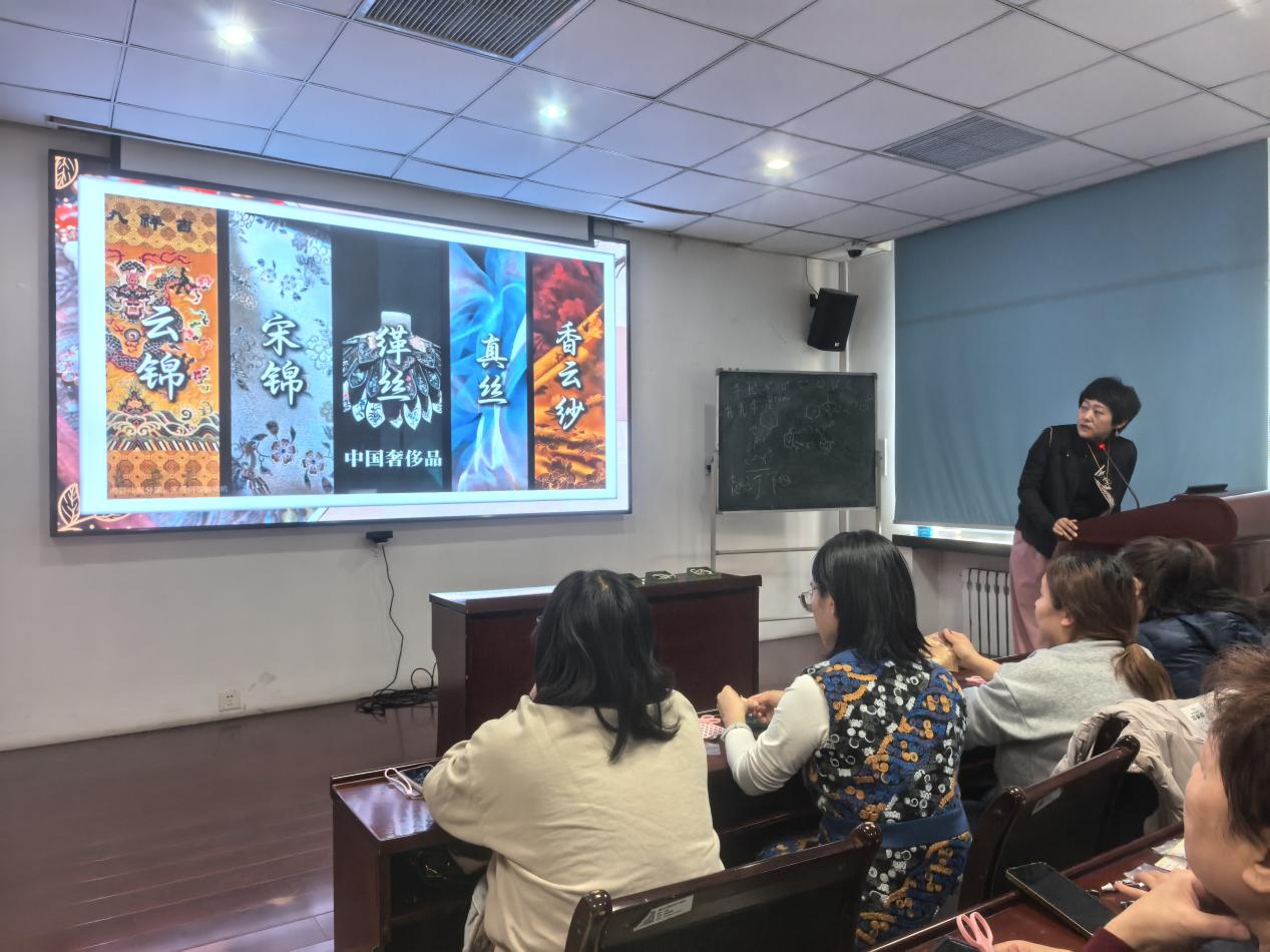宋锦,被誉为中国“锦绣之冠”,与南京云锦、四川蜀锦、广西壮锦并称为我国四大名锦,其织造技艺承载着中华民族千年的审美智慧与工艺积淀。此次活动请来了专业指导老师结合详实的史料与生动的案例,为老师们系统讲解了宋锦的发展脉络、工艺特色与文化价值。从北宋末年的起源沿革,到2006年入选首批国家级非物质文化遗产名录、2009年跻身联合国人类非物质文化遗产代表作名录的辉煌历程,从“一寸宋锦,一寸金光”的珍贵价值,到色泽华丽、图案精致、质地坚柔的艺术特点,通过讲解让老师们对这门古老的非遗技艺有了全方位、深层次的认知。