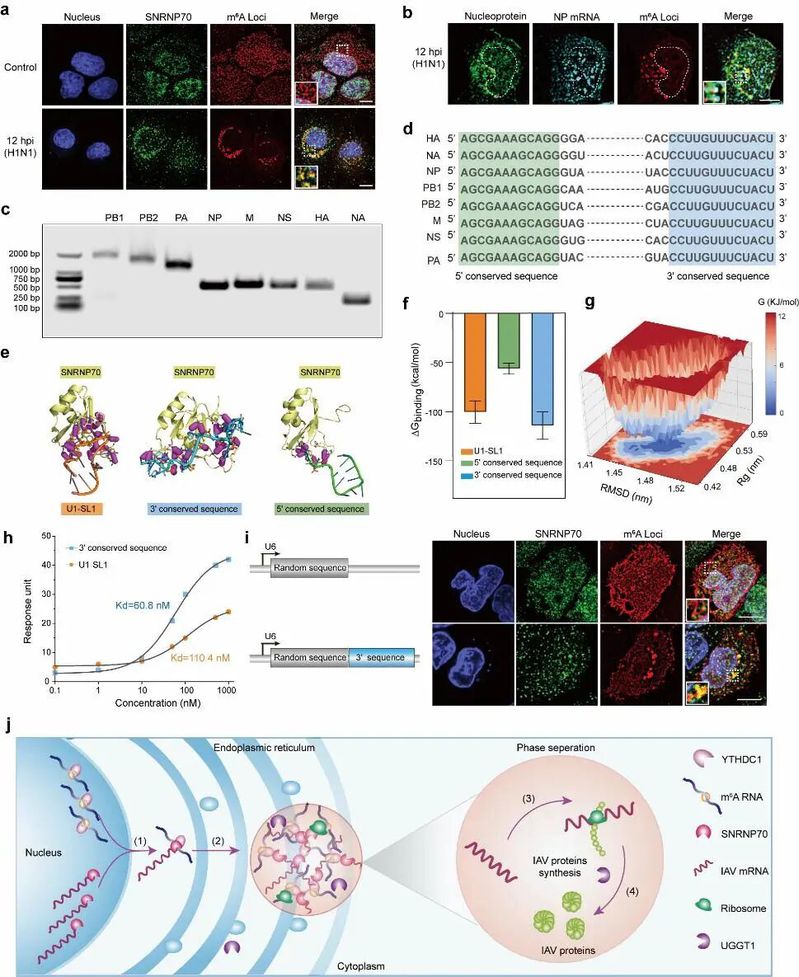 进一步地,将此技术应用于IAV感染的细胞,取得了关键发现。如图3所示,病毒感染后,在宿主细胞质中形成了富含m6A修饰RNA和病毒蛋白的相分离凝聚体。组学分析揭示病毒感染通过上调宿主核糖体相关mRNA的m6A修饰,劫持宿主翻译机制以支持自身mRNA的成熟、转运及蛋白的正确折叠与高效合成。随后的研究表明,宿主剪接体关键蛋白SNRNP70是连接病毒mRNA与宿主相分离机器的关键桥梁,SNRNP70与甲型流感病毒mRNA的3‘保守末端序列具有强结合力,这种强相互作用促使SNRNP70伴随病毒mRNA一同进入细胞质,并在内质网区域通过与m6A阅读蛋白YTHDC1等因子的互作,共同驱动了富含病毒组分和宿主因子的液-液相分离凝聚体的组装。该研究阐明了m6A在核糖体相关mRNA上的上调,以及UGGT1和SNRNP70蛋白质在凝聚体中的富集,共同将IBs重编程为病毒蛋白合成的工厂的机制,确立了m6A介导的相互作用是调控病毒-宿主区室形成和功能的关键。