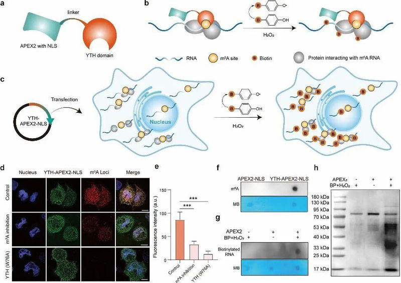 该技术利用YTH-APEX2融合蛋白在活细胞内对m6A位点及其邻近分子进行特异性生物素标记(图1),从而能够在原位对m6A进行空间成像(m6APL-Img)、对m6A修饰的RNA进行转录组测序(m6APL-Seq),并系统鉴定与m6A RNA相互作用的蛋白质(m6APL-MS)。研究人员设计了一种双功能融合蛋白,将m6A阅读器YTH结构域与工程化过氧化物酶APEX2通过柔性连接子连接,添加了核定位序列。该蛋白能特异性结合细胞内的m6A修饰位点,并在其附近催化生物素-酚生成活性自由基,从而特异性可视化细胞内的m6A位点,并有效生物素化m6A修饰的RNA和与m6A位点相互作用的蛋白质(图2)。这些结果共同证明了m6APL技术的高特异性和可靠性,为后续研究奠定了基础。