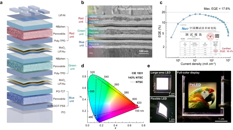 在叠层器件设计方面,团队进一步构建了基于LiF/Au/MoO3的高效子单元连接层,通过界面偶极调控与隧穿辅助注入机制,大幅降低电荷生成势垒,实现仅约0.5伏的总电压损耗。依托无损转印工艺与优化互联结构,团队成功构筑全钙钛矿红绿蓝三结串联白光LED。器件最高亮度达67,370 cd m-2,峰值外量子效率达17.6%,经权威机构认证效率为16.4%,色域覆盖达到NTSC标准的143%,各项关键性能指标均显著超越既往报道的钙钛矿基串联白光LED。