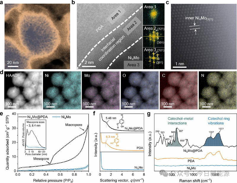 图2. Ni₄Mo@PDA的结构表征。(a) HAADF-STEM图像。(b) ABF-STEM图像及相应的FFT图。(c) 原子尺度STEM图像。(d) HAADF-STEM图像及Ni、Mo、O、C、N的EDS元素面分布图。(e) N₂吸附-脱附等温线。(f) SAXS图谱。(g) 拉曼光谱。