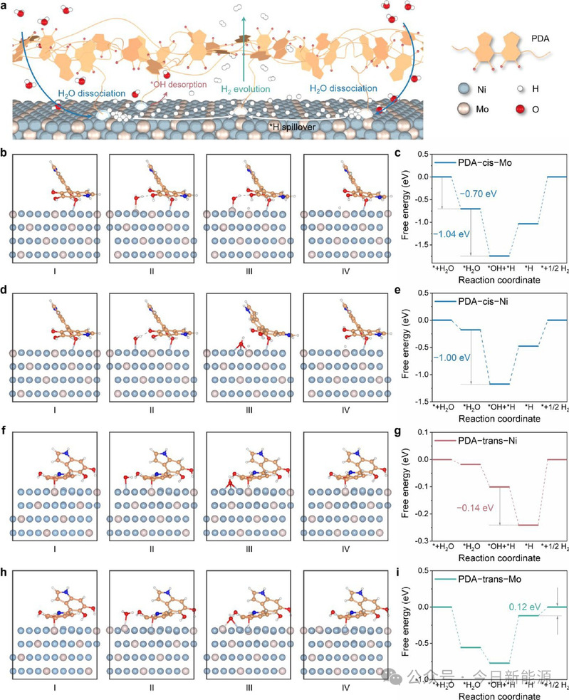 图6. 催化机理的计算理解。(a) Ni₄Mo@PDA上PDA配位多位点网络的示意图。亮蓝色和米色球体代表PDA配位的Ni和Mo位点。(b-i) HER在PDA-cis-Mo、PDA-cis-Ni、PDA-trans-Ni和PDA-trans-Mo位点上的优化构型(b,d,f,h)及相应的吉布斯自由能曲线(c,e,g,i)。原子颜色:蓝色,Ni;米色,Mo;橙色,C;红色,O;深蓝色,N;白色,H。快照:(I) PDA配位构型,(II) H₂O吸附,(III) H₂O解离为*OH和*H,(IV) H₂形成/脱附。