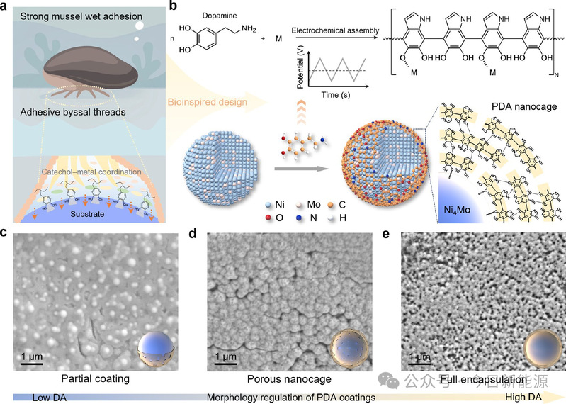 图1. PDA包覆Ni₄Mo电催化剂的仿生合成及形貌调控。(a) 由儿茶酚-金属配位介导的贻贝仿生湿粘附。(b) Ni₄Mo@PDA电化学组装示意图。(c-e) 通过多巴胺浓度调控形貌的PDA包覆Ni₄Mo的SEM图像:部分包覆(c)、多孔纳米笼(d)和完全封装(e)。