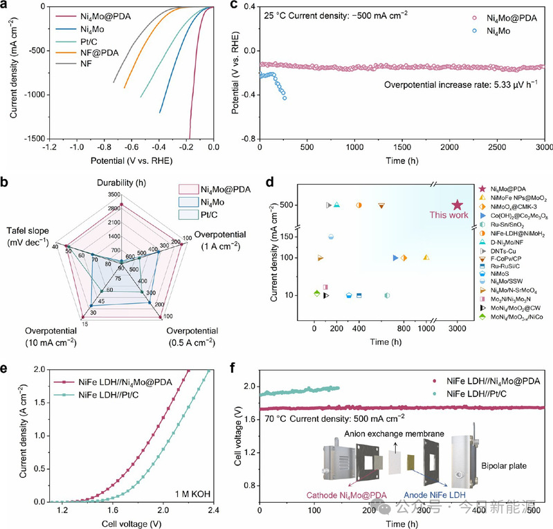 总之,该研究开发了一种电化学可控的仿生Ni₄Mo@PDA催化剂合成方法,其中PDA纳米笼涂层调和了Ni-Mo合金电催化剂长期存在的活性与稳定性之间的权衡关系。受贻贝儿茶酚-金属配位化学的启发,该策略将强健的湿粘附性和耐久性转化为一种提升催化剂性能的有效方法。PDA纳米笼涂层赋予Ni₄Mo多种特性,包括多位点界面催化网络、强健的配位限域以及刚性-柔性机械应力缓冲。因此,所合成的Ni₄Mo@PDA催化剂在高电流密度下的碱性HER中表现出极低的过电位和超长稳定性。除了Ni₄Mo@PDA之外,这种仿生刚性-柔性涂层策略将为稳定用于电催化的非贵金属基材料开辟一条新途径。