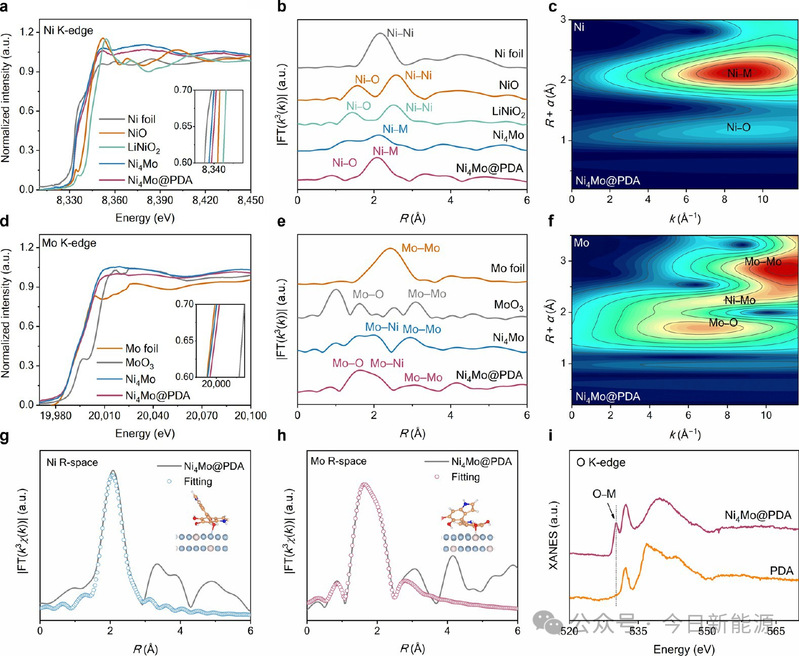 图3. Ni₄Mo@PDA的界面配位与电子结构。(a,d) Ni和Mo K-edge XANES谱。(b,e) Ni₄Mo@PDA及参照样品的FT-EXAFS谱。(c,f) WT-EXAFS等高线图。(g,h) Ni₄Mo@PDA的FT k³加权Ni (g)和Mo (h) K-edge EXAFS谱及相应的拟合曲线。插图为优化的结构模型(橙色、红色、蓝色、青色和米色球体分别代表碳、氧、氮、镍和钼原子)。(i) Ni₄Mo@PDA和PDA的O K-edge XANES谱。