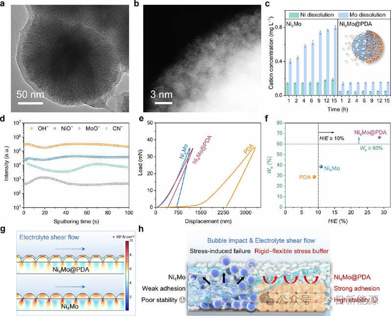 图5. Ni₄Mo@PDA的稳定性分析。(a) Ni₄Mo@PDA在1 M KOH中以|j| = 500 mA cm⁻²运行1000 h后的TEM图像和(b) HAADF-STEM图像。(c) HER过程中电解液中溶解的Ni和Mo浓度。(d) HER后Ni₄Mo@PDA中碎片的动态TOF-SIMS深度剖面图。(e) Ni₄Mo@PDA及对比样品的载荷-位移曲线。(f) 各样品的计算H/E和Wₑ值。(g) 电解液流动下Ni₄Mo@PDA和Ni₄Mo中应力分布的有限元模拟。(h) 在气泡和流动应力下Ni₄Mo的失效对比Ni₄Mo@PDA的刚性-柔性应力缓冲。